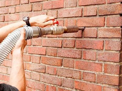 Un hombre que lleva un casco está trabajando en una pared de ladrillos.